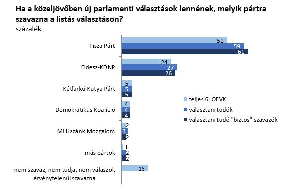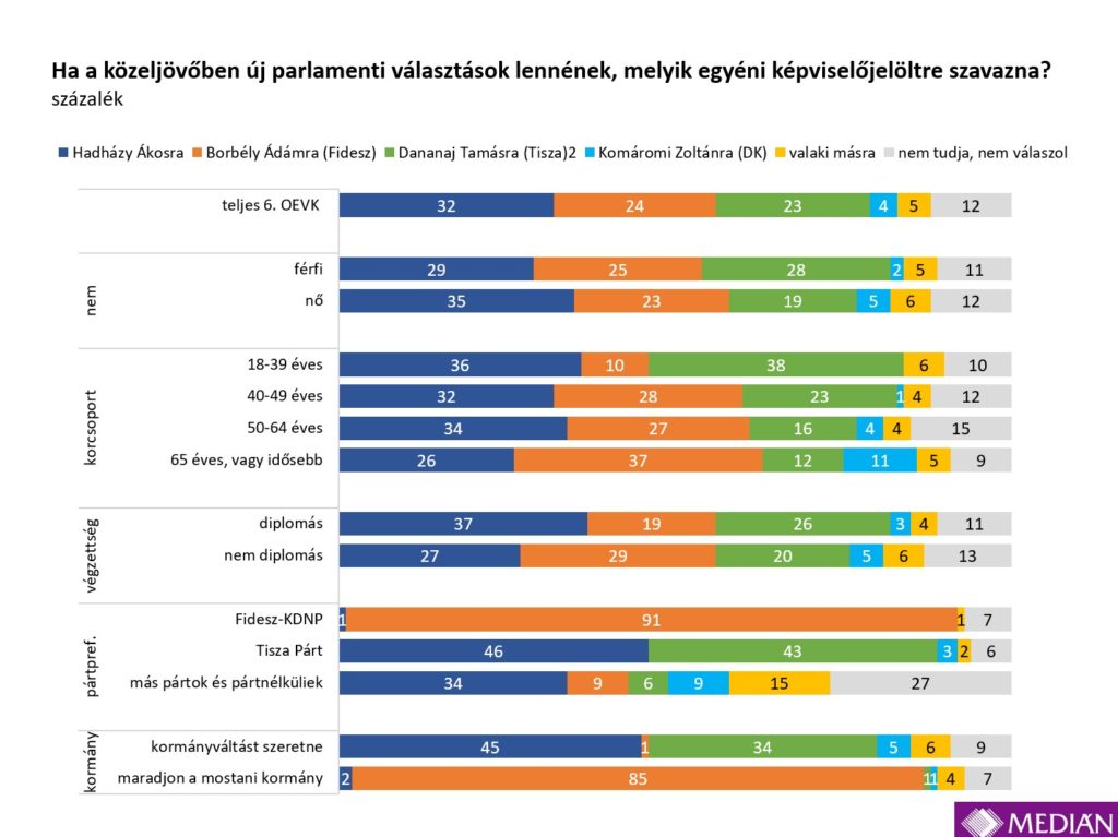 Ha a Fidesz ellenében csak egy ellenzéki jelölt indulna, akkor Hadházy Ákosra is, és a Tisza Párt jelöltjére is átszavazna az ellenzéki tábor döntő többsége. Ezekben a kérdésekben már nem név szerint szerepeltek a valószínűsített jelöltek, hanem a Fidesz és a Tisza jelöltjei csak általánosan voltak megnevezve. Hadházy 65-29 százalékra verné meg a fideszes jelöltet, a tiszás jelölt pedig 64-28-ra nyerne. Nincs tehát markáns különbség abban, hogy a Fidesszel szemben egy az egy elleni küzdelemben hogyan szerepelne egyik vagy másik ellenzéki képviselőjelölt.