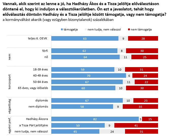 A rugalmas átszavazásokkal és a két jelölt esetén csökkenő bizonytalan-aránnyal is összhangban van, hogy a kormányváltást akarók 63 százaléka támogatná, hogy előválasztáson dőljön el, hogy a Fidesz ellen Hadházy Ákos vagy a Tisza jelöltje induljon el. A kerületiek 69 százaléka szeretne kormányváltást, 27 százalék szeretné a jelenlegi kormány maradását és 4 százalék bizonytalan a kérdésben. A kormányváltást akarók (vagy ezügyben bizonytalanok) minden demográfiai csoportjában 58 százalék feletti az előválasztást támogatók aránya és legfeljebb egyharmados az azt ellenzőké. A Hadházy Ákost támogatók 82 százaléka támogatja az előválasztást, de még a tiszás jelöltet pártolók fele is azt szeretné, hogy előválasztáson dőljön el az ellenzéki induló személye.