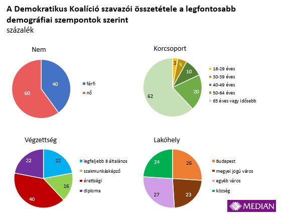 A Demokratikus Koalíció szavazóinak 62 százaléka rendelkezik legalább érettségivel, 22 százalékuknak felsőfokú végzettsége is van, ezzel a DK-s szavazóbázis kissé kevésbé képzett a Tisza szavazóinál, de jelentősen képzettebb a Fidesz-szavazóknál. A lakóhely szerinti összetétel nagyon kiegyensúlyozott, hasonló számban vannak a DK szavazói között a fővárosiak, mint a megyeszékhelyeken, kisebb városokban vagy falvakban élők. A többi párthoz viszonyítva a DK a fővárosban és a megyei jogú városokban erősebb és a kisebb településeken gyengébb. Ezek a különbségek azonban eltörpülnek a korosztályos összetételhez képest.