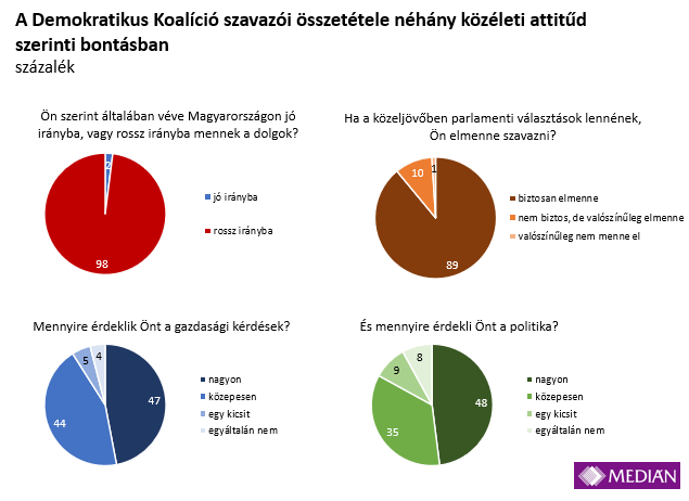 Hónapról hónapra az rajzolódik ki a közvélemény-kutatásokból, hogy a Tisza szavazói sokkal kritikusabbak és érdeklődőbbek a különböző közéleti kérdésekkel kapcsolatban, mint a fideszesek, vagy az „óellenzék” szavazói. A DK szavazói viszont a tiszásokhoz hasonló mértékben kritikusak az ország helyzetével kapcsolatban – 98 százalékuk szerint rossz irányba mennek a dolgok Magyarországon -, és a gazdasági és politikai kérdések is a Tisza-szavazókhoz hasonló mértékben a DK-sokat érdeklik a legnagyobb arányban. Sőt, a gazdasági kérdések iránt a DK-sok talán még a tiszásoknál is egy árnyalatnyival jobban érdeklődnek.