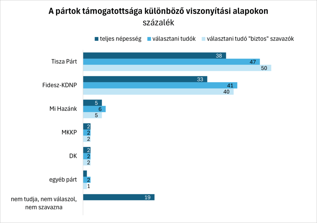 A választani tudók körében 4 százalékponttal, 6 pontra szűkült a Tisza Párt előnye, míg a magukat biztos szavazónak mondók körében 3 százalékponttal csökkent a különbség, és most 50-40-re vezet a Tisza a kormánypárttal szemben.