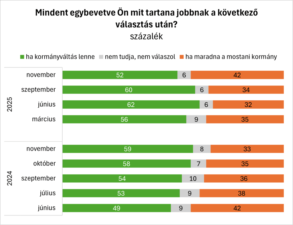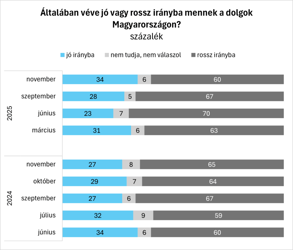 Tisza Párt őrzi ugyan vezető pozícióját, de az mindenképp aggasztó lehet Magyar Péter számára, hogy a közhangulat megváltozni látszik. A kormányváltást akarók aránya jelentősen, a szeptemberi 60 százalékról 52 százalékra csökkent, ami 2024 nyara óta a legalacsonyabb arány. Ugyancsak számottevő változás, hogy – ugyancsak a legutóbb 2024 nyarán tapasztalthoz hasonlóan – 34 százalék szerint jó irányba, míg 60 százalék szerint rossz irányba tartanak a dolgok Magyarországon, amely adat borús képet fest ugyan, de javulás a szeptemberi 28-67-es arányhoz képest. Talán még ezeknél is bíztatóbb lehet a Fidesz számára, hogy az előző hónapoktól eltérően, novemberben ismét többen valószínűsítik a kormánypárt győzelmét: 40-ről 45 százalékra nőtt azoknak az aránya, akik szerint a Fidesz fog nyerni a következő választáson, miközben 43-ról 38 százalékra csökkent azoké, akik a Tisza győzelmében hisznek.