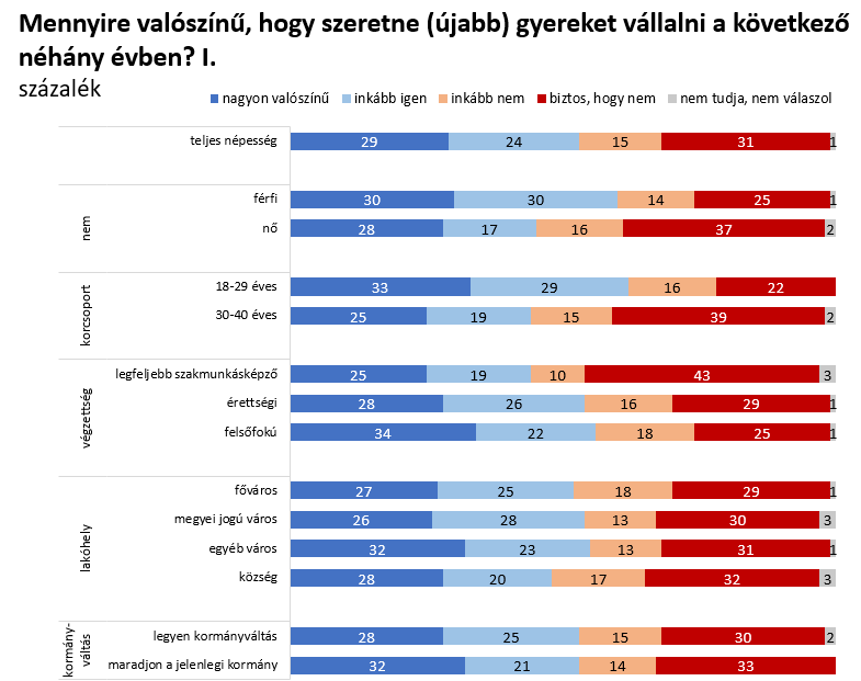 Ezek között a tényezők között azt is vizsgálta a felmérés, hogy mennyiben befolyásolná a gyermekvállalási szándékot az, ha 2026-ban kormányváltás következne be. Bár a tényezők sorrendjében az utolsó előtti helyen végzett a kormányváltás, a gyermekvállalásban bizonytalanok több mint fele inkább hajlana a gyerekvállalásra, ha 2026-ban kormányváltás lenne, míg ha 2026 után is maradna a jelenlegi kormány, az csak az emberek 15 százalékát tolná jobban a gyermekvállalás irányába. A 30 év alattiaknak, a megyei jogú városokban élőknek, az alacsonyabb végzettségűeknek és a nehezebb anyagi körülmények között élőknek a 2026-os kormányváltás különösen nagy szerepet játszana a gyermekvállalásban.