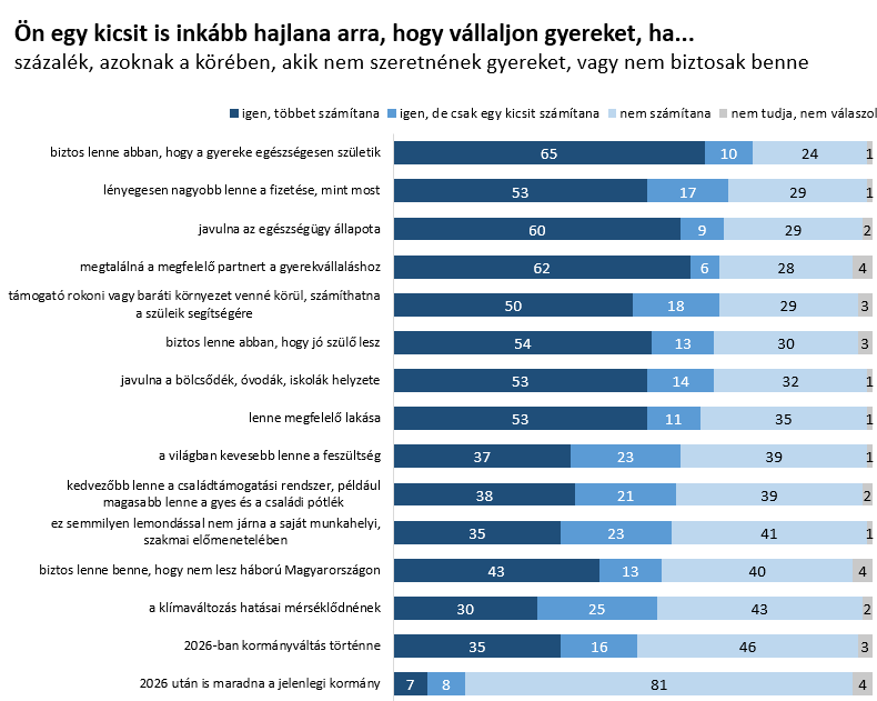 A másik oldalról, azok körében, akik nem vagy nem biztosan akarnak gyermeket a következő években, szinte az összes vizsgált tényező pozitívan hatna a gyerekvállalási hajlandóságra. A gyermekvállalásban bizonytalanok háromnegyede inkább vállalna gyermeket, ha biztos lehetne a születendő gyermek egészségében. Kétharmadukat az is ösztönözné, ha lényegesen nagyobb lenne a fizetése, javulna az egészségügy, oktatás állapota, megtalálná a megfelelő partnert, támogató rokoni-baráti környezet segítené a gyermekvállalásban, biztos lenne abban, hogy jó szülő lesz, vagy lenne megfelelő lakása.