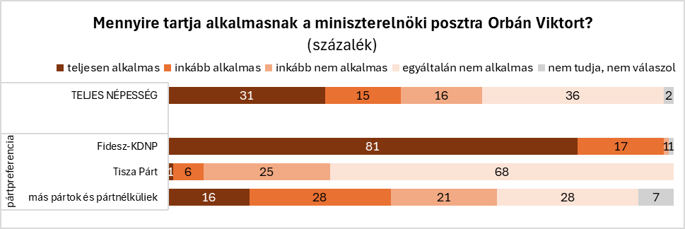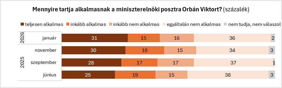 Januárban a Tisza elnökét tartották többen alkalmasnak a miniszterelnöki posztra. A Tisza Párt elnökéről a szavazókorú népesség 54 százaléka, míg a hivatalban lévő miniszterelnökről 46 százalék gondolja, hogy alkalmas. Ugyanakkor fontos különbség, hogy Orbán esetében közel kétszer annyian vannak, akik „teljesen” alkalmasnak tartják őt (31 százalék), mint amennyien Magyart (16 százalék) – az utóbbit a relatív többség „inkább” alkalmasnak tartja (38 százalék).