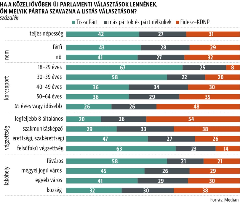 Változatlanul a 30 év alattiaknál a legerősebb a Tisza Párt, melléjük azonban felzárkóztak a diplomások is: a felsőfokú végzettséggel rendelkezőknek már a 63 százaléka támogatja a Tiszát, 10 százalékponttal többen, mint a januári Medián-felmérésben. Ugyanakkor a legalacsonyabb végzettségűek körében is növelni tudta a népszerűségét a Tisza Párt, de itt még mindig a Fidesz vezet jelentős fölénnyel.
