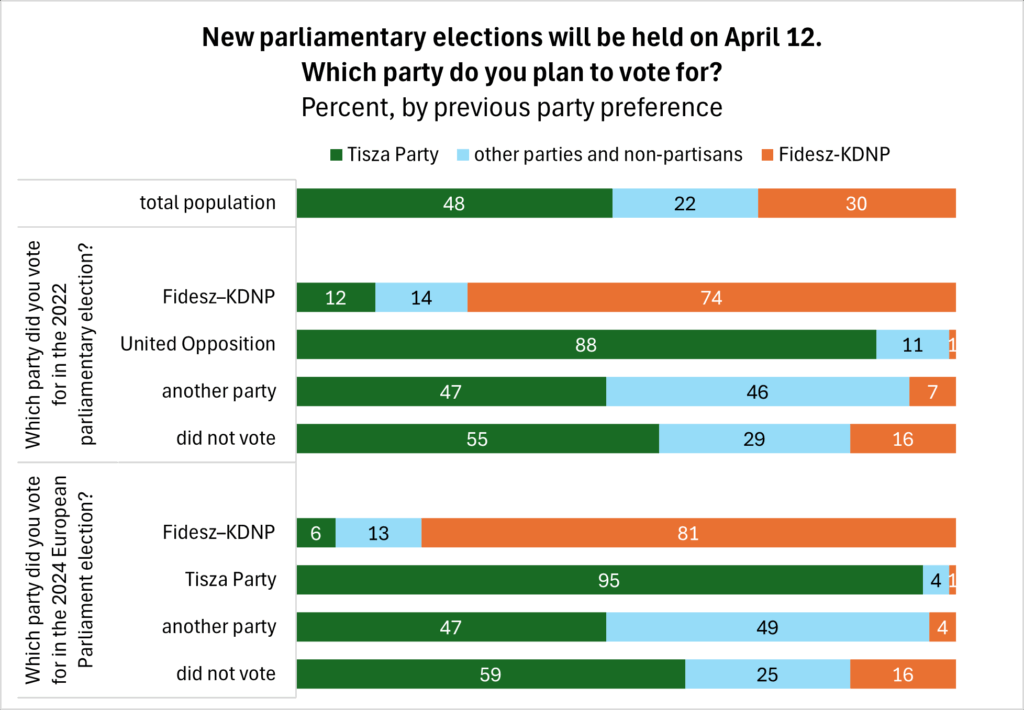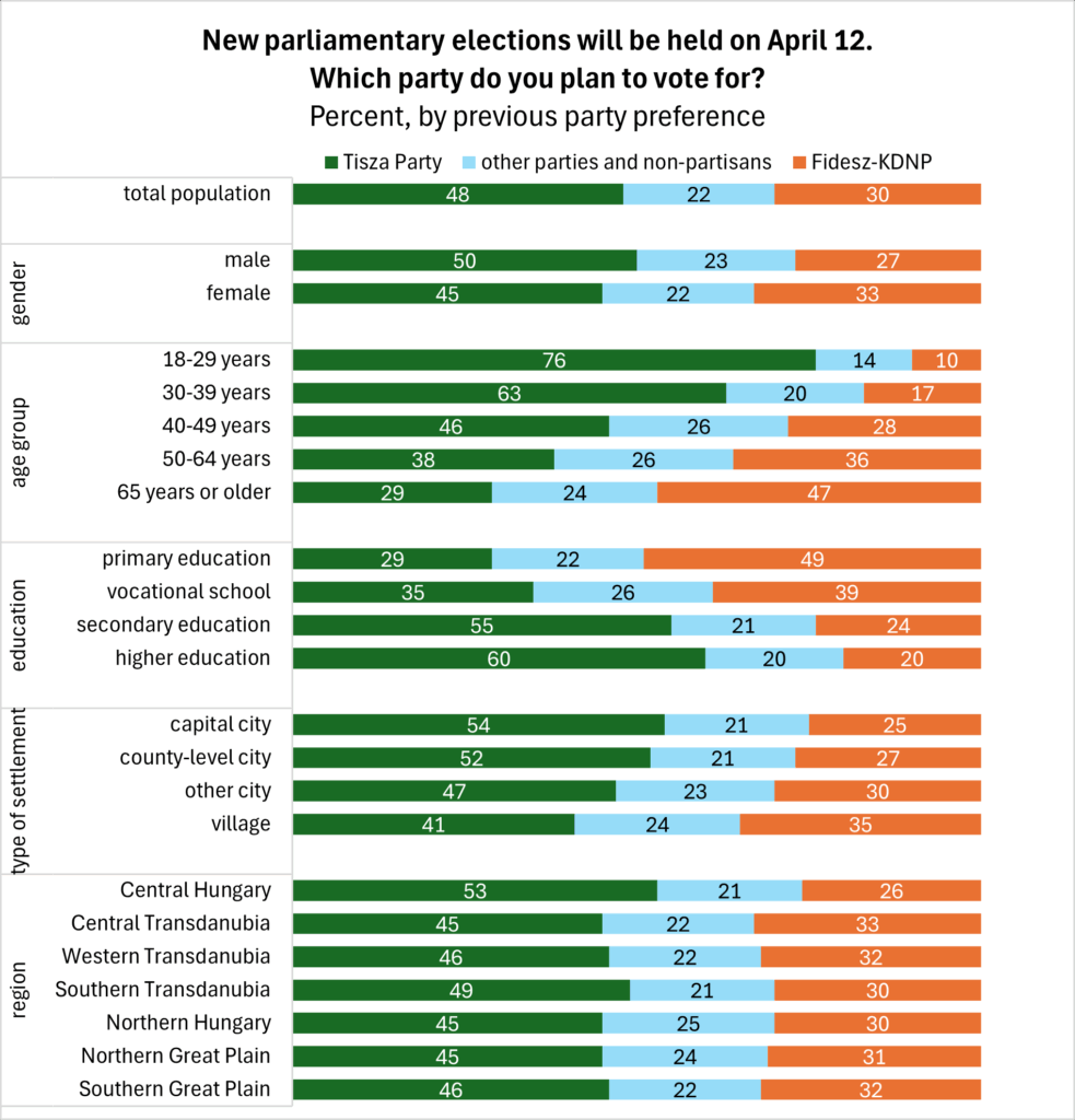 The 2024 European Parliament election was the Tisza Party’s first real test, when it secured 30 percent of the vote. Of those voters, 95 percent still support Tisza today. Beyond them, 47 percent of those who voted for other parties at the time, and 59 percent of those who abstained, would now vote for the list led by Péter Magyar on April 12. Fidesz has been less successful in retaining its supporters: eight-tenths of those who voted for the party in June 2024 would vote for it again in the 2026 parliamentary election, 6 percent have switched to Tisza, and 13 percent have become uncertain—either they would not vote or would instead support one of the smaller parties.