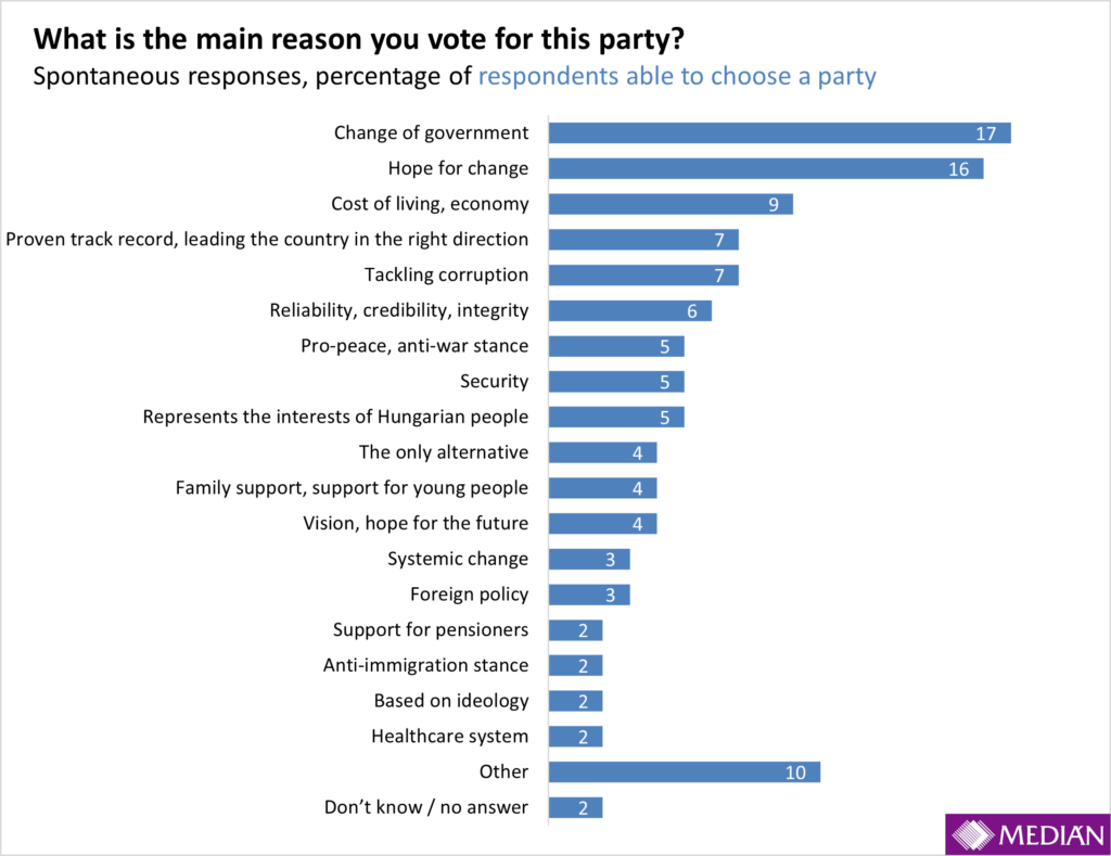 If we look only at the responses of Fidesz voters, the majority of them vote for the ruling party because they believe it has already proven that it is leading the country in the right direction: for 17 percent, this is the primary reason for their support of Fidesz. In second place—tied—are acceptance of the party’s rhetoric and economic reasons. Among the latter, most mentioned that they owe their own financial security to Fidesz. Many feel that they have never lived as well as they have in recent years. One in ten Fidesz supporters specifically mentioned support for families, while security was the main reason for 12 percent