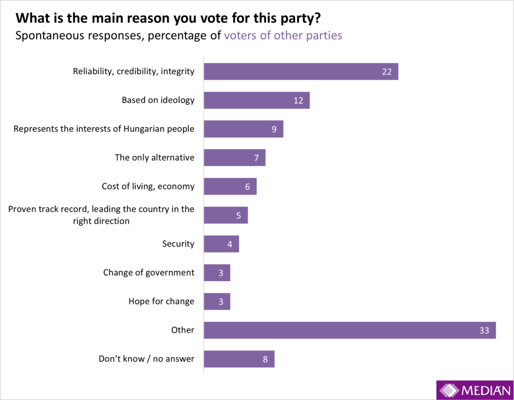 Supporters of other opposition parties form a significantly smaller group, even taken together, than those of Fidesz or Tisza. While it is difficult to identify a single unifying rationale among them, some patterns can still be observed. Voters of smaller parties are less motivated by opposition to the current government and more by the perceived value of their chosen party: 22 percent consider it trustworthy, credible or principled, while 12 percent base their choice on ideological grounds. The most common motivations nationwide—government change and change in general—appear only to a negligible extent in this group as primary reasons for voting.