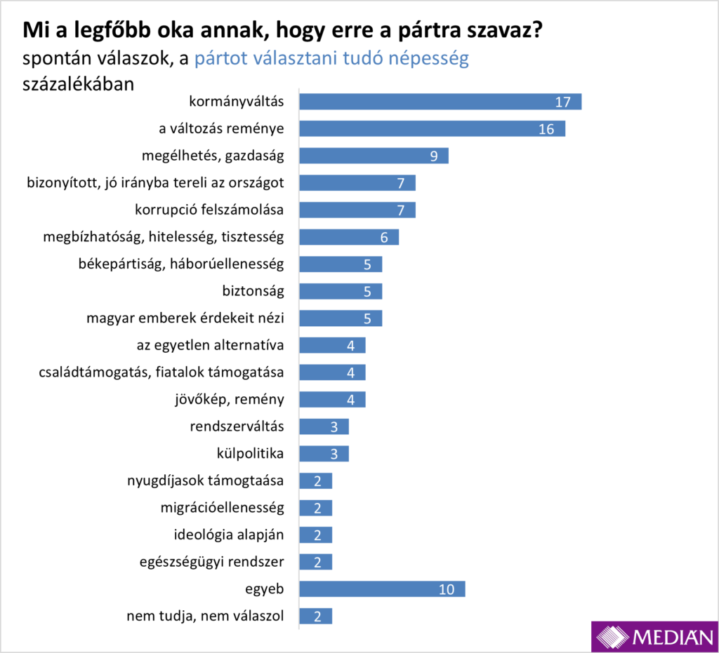 Az eredmények természetesen igen széttartóak, ha a szavazóközönség összességét tekintjük. A pártot választani tudók 17 százaléka állítása szerint a kormányváltás érdekében, 16 százalék a változás reményében szavaz – ez a két, más szavakkal megfogalmazott, de lényegében azonos indok a legjellemzőbb az idei pártválasztás során. Innentől viszont egymást váltják a kormánypárti és ellenzéki érvek: sokak a saját megélhetésük szempontjából, mások az országos korrupció ellen szavaznak, vannak, aki szerint az Orbán-kormány bizonyította a rátermettségét, mások az ellenzék egyes pártjaiban látnak hiteles és megbízható alternatívát, de a békepártiság és háborúellenesség is épp annyiszor felmerült a válaszokban, mint az ország és az országban élő emberek érdekeinek a képviselete.