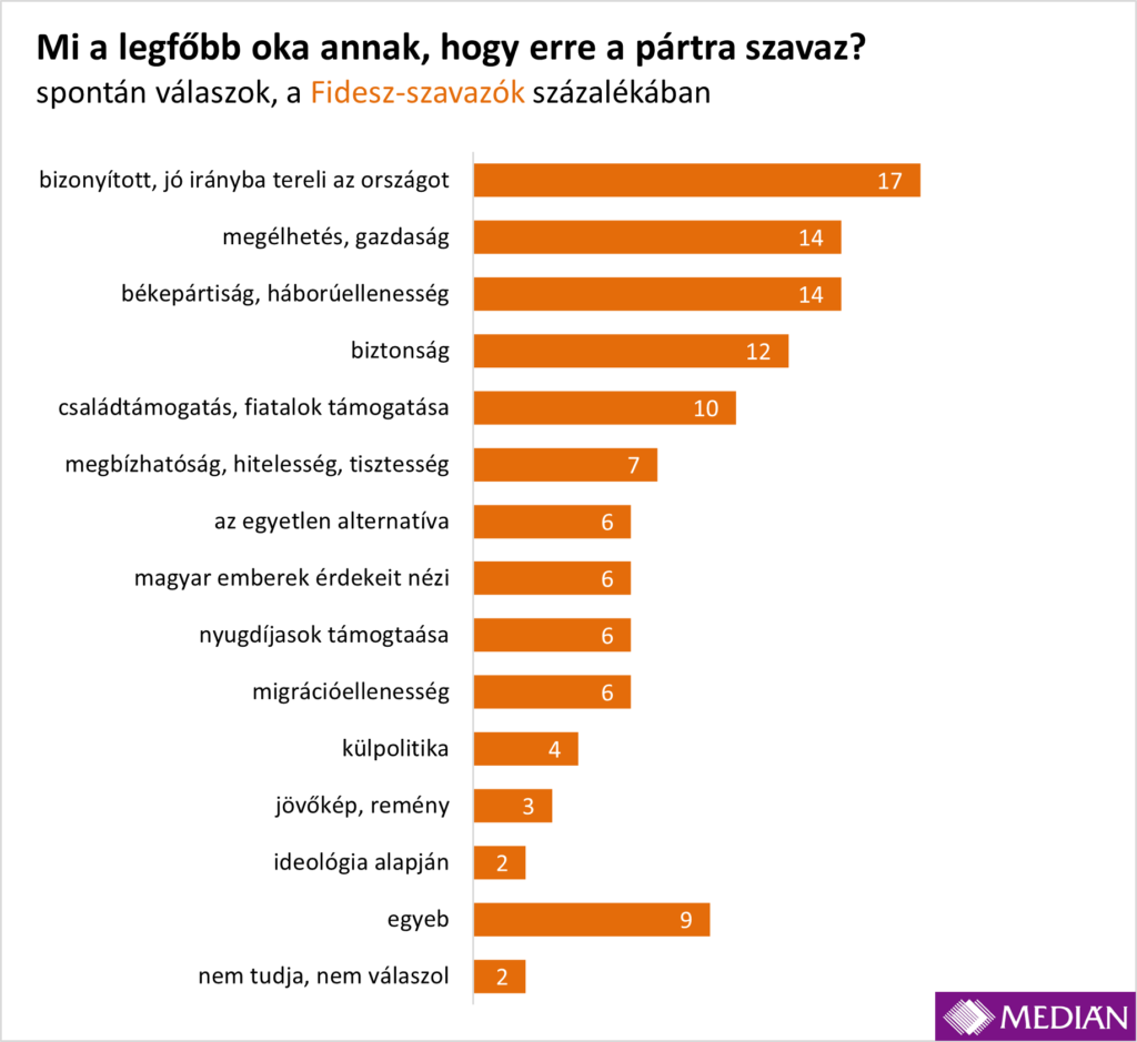 A Fidesz-szavazók legnagyobb része azért szavaz a pártjára, mert az elmúlt években szerintük bizonyította, hogy jó irányba viszi az országot, 17 százalék számára ez a Fidesz-pártiságuk elsődleges indoka. A második helyen holtversenyben a békepárti retorika elfogadása és a megélhetési okok állnak. Az utóbbiak között a legtöbben azt említették, hogy a saját anyagi biztonságukat a Fidesznek köszönhetik, sokan érzik úgy, hogy nem éltek még olyan jól, mint az elmúlt években. A családok támogatását minden tizedik fideszes külön is említette, a biztonság pedig 12 százalék számára volt a legfőbb indok.