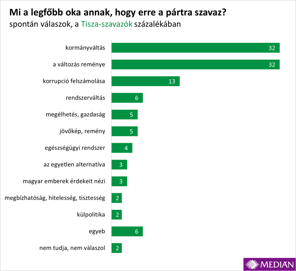 A Tisza-szavazók indokai sokkal kevésbé szóródnak, mint a Fidesz-táboré: 32 százalék elsősorban a kormányváltás érdekében szavaz Magyar Péter pártjára (ezen felül 6 százalék kimondottan rendszerváltást akar), szintén 32 százalék a „változás reményében”, 13 százalék pedig a korrupció felszámolását várja a Tisza győzelmétől. Minden más indok legfeljebb 5 százalékot ért el a tiszások körében, tehát a Tisza szavazóinak elsöprő többsége elsősorban nem a párt valamilyen erénye miatt, hanem a jelenlegi kormány ellen szavaz.