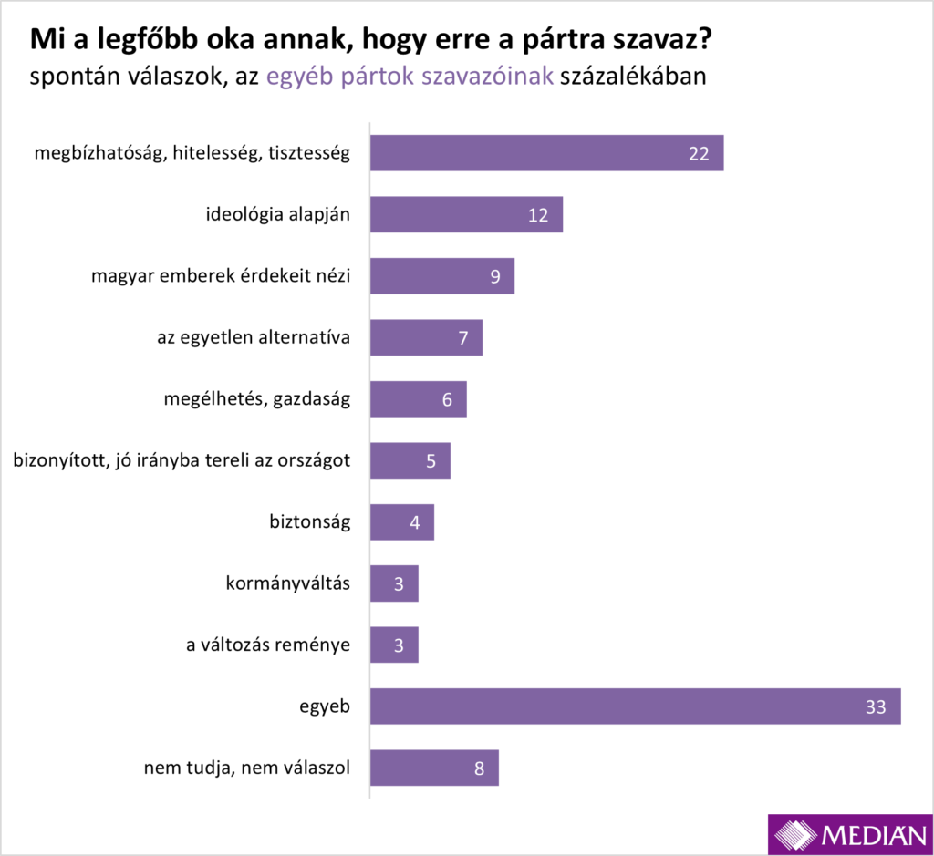 A többi ellenzéki párt szavazói bár még összevontan is jelentősen kisebb csoportot alkotnak, mint a Fidesz vagy a Tisza hívei, és náluk nehezen is ragadható meg valamilyen egységes elgondolás, de néhány érdekes következtetés így is levonható a válaszaik alapján. A kisebb pártok szavazói kevésbé a jelenlegi kormány ellen, inkább a választott pártjuk értékajánlata miatt szavaznak: 22 százalékuk megbízhatónak, hitelesnek vagy tisztességesnek tartja a pártját, 12 százalék pedig valamilyen ideológia alapján választott tesz oda a voksát. Az országosan legjellemzőbb indokok (kormányváltás, változás) csak elhanyagolható arányban jelent meg ebben a csoportban a szavazás elsődleges okaként.
