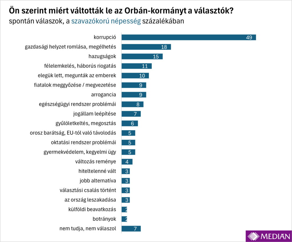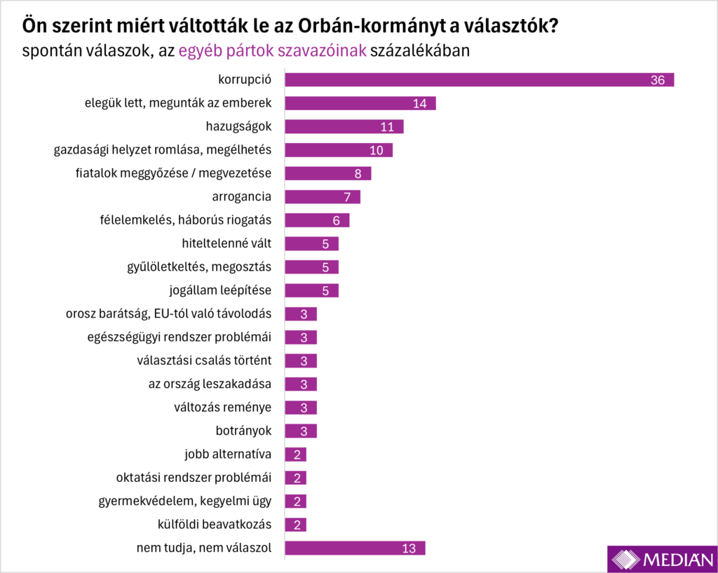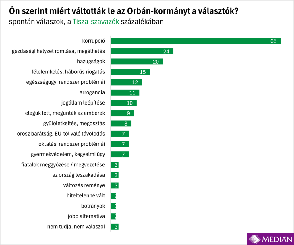 Habár nem a korrupció szerepel a megoldandó ügyek listájának az élén, egy másik toplistán toronymagasan első lett: a választók fele szerint a Fidesz a korrupció miatt vesztette el a választást. A Tisza szavazóinak kétharmada, a kis pártok és párt nélküliek több mint egyharmada, de még a Fidesz-szavazók 18 százaléka is megjelölte a korrupciót az Orbán-kormány bukásának okaként, igaz, az utóbbiak közül néhányan hozzátették, hogy „állítólag”.