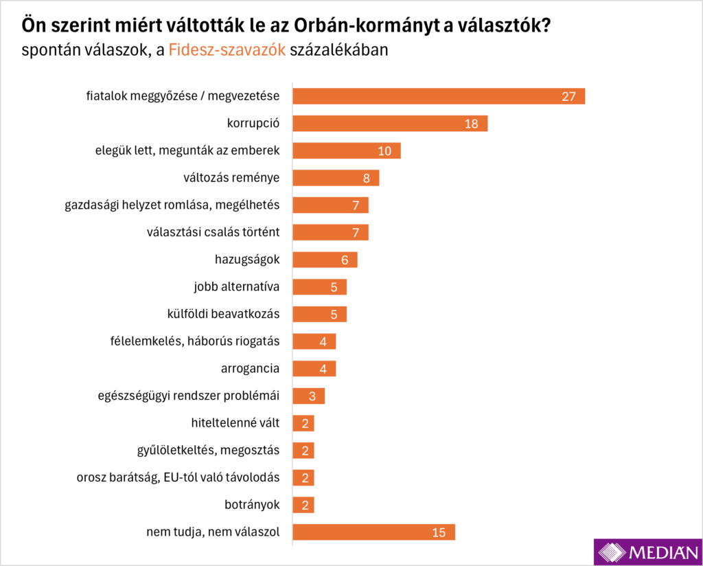 A fideszesek ebben a kérdésben is egy kicsit másképp vélekedtek, mint a nyertes párt szavazói, vagy akár a két nagy táboron kívüliek. Az Orbán-hívők 27 százaléka szerint a fiatalok félrevezetése okozta a Fidesz bukását. Bár nem olyan sokan, de voltak, akik szerint választási csalás történt, vagy külföldi beavatkozás okozta a rendszer leváltását. A többség azonban a leköszönő kormánypárt szavazói között is úgy látja, hogy a társadalom nagy részét zavarta a korrupció, a hazugságok és a megélhetési nehézségek, betelt a pohár, az emberek változást akartak.