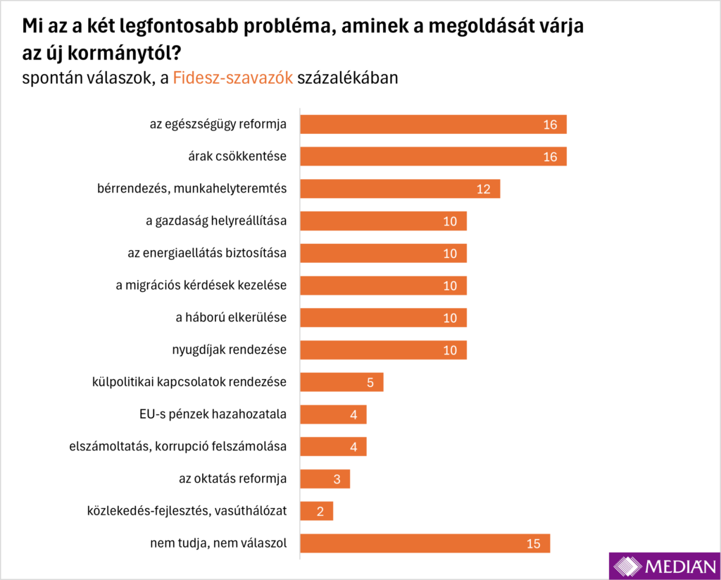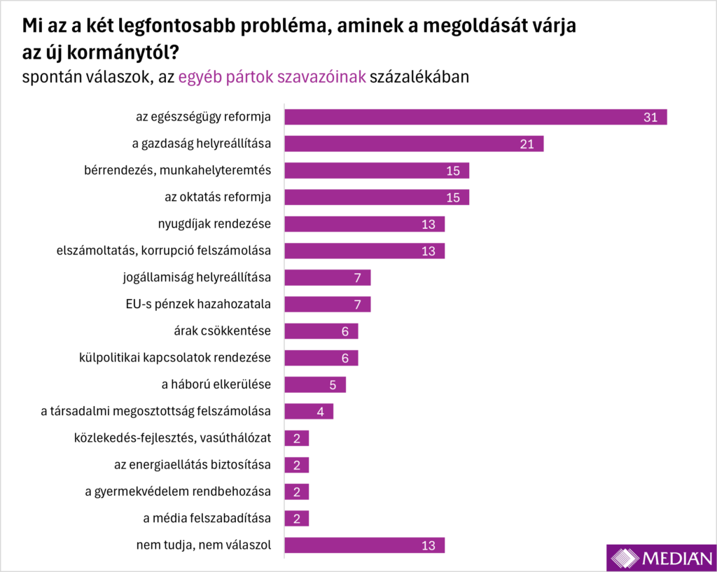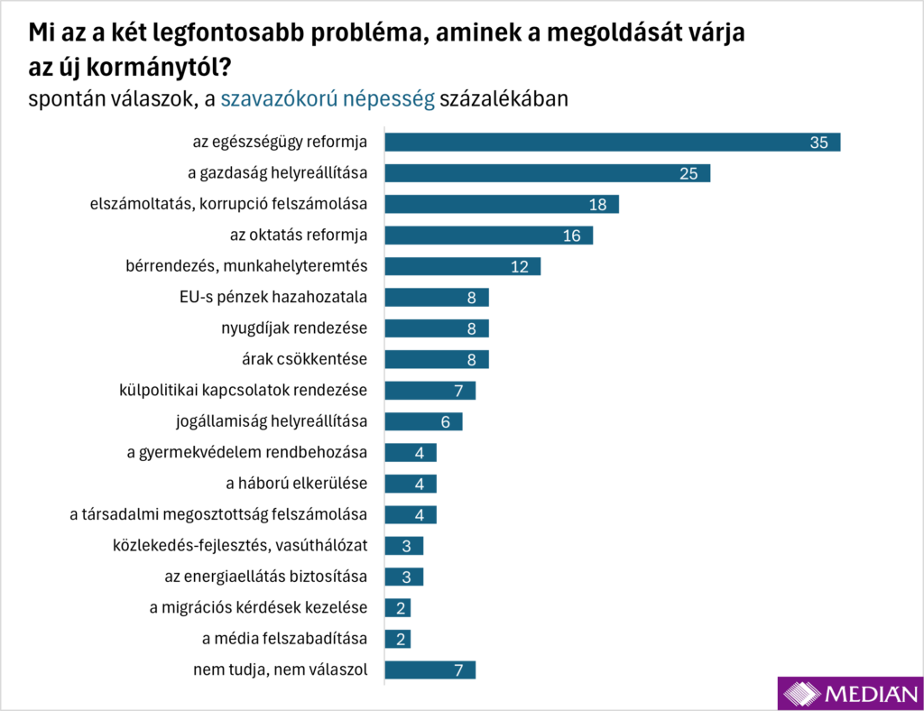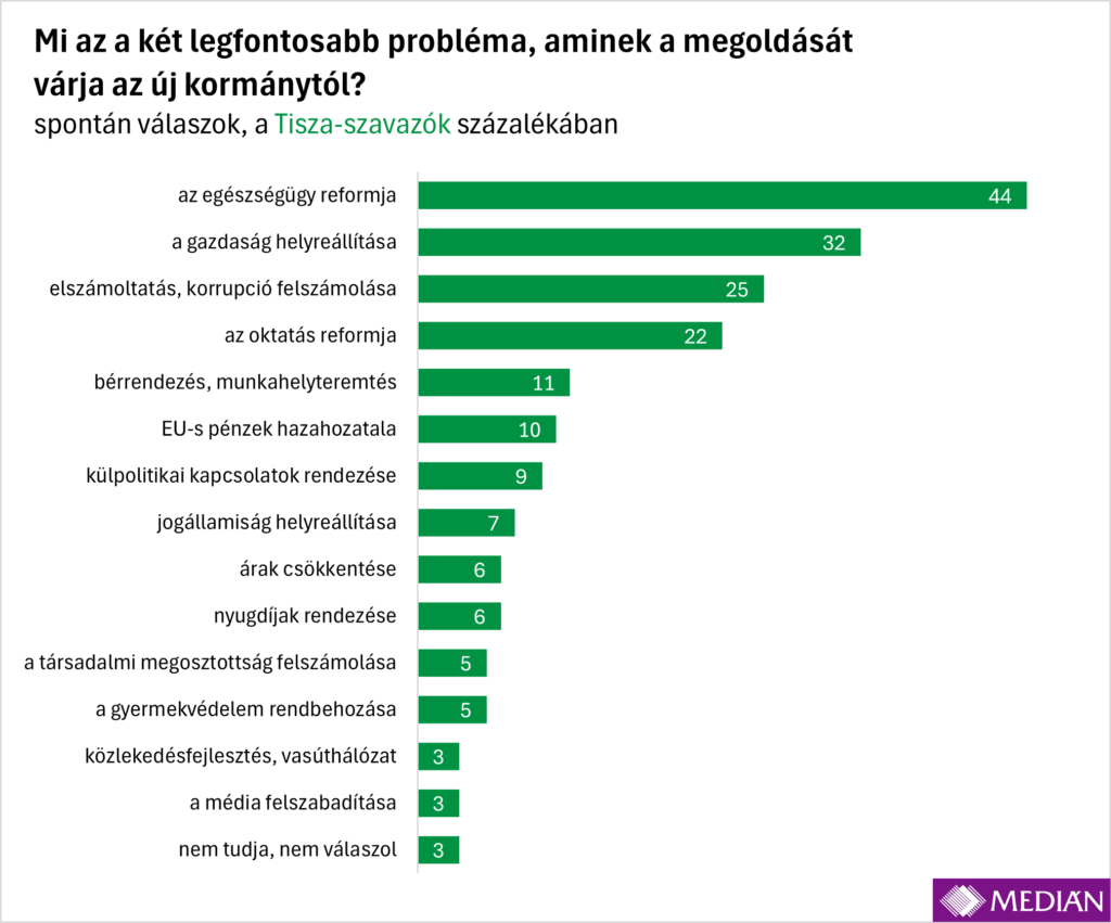 Az egészségügy reformját sorolták a legtöbben a legfontosabb megoldandó két ügy közé (minden harmadik ember említette), ráadásul ebben a kérdésben széleskörű a társadalmi egyetértés: mind a tiszásoknál, mind a fideszeseknél, de a kis pártok támogatói vagy a párt nélküliek körében is az egészségügyi rendszer helyreállítása vezeti a prioritáslistát. A Tisza szavazói különösen nagy arányban tartják ezt a legfontosabb problémának: 44 százalékuk „szavazta be” a top2-be.